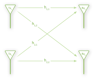 Therefore, "multiple-input" refers to multiple transmitter antennas, since they input a radio signal into the channel, and "multiple-output" refers to multiple receiver antennas, since they take output from the channel and into the receiver. What if there is only one receiver antenna? This is then "single-output," and we can have a multiple-input single-output configuration. Commonly used terms such as 2×2 MIMO refer to a configuration with two transmitter antennas and two receiver antennas. This can be generalized by describing an NxM system, where N is the number of transmitter antennas, M is the number of receiver antennas, and N is not necessarily equal to M.